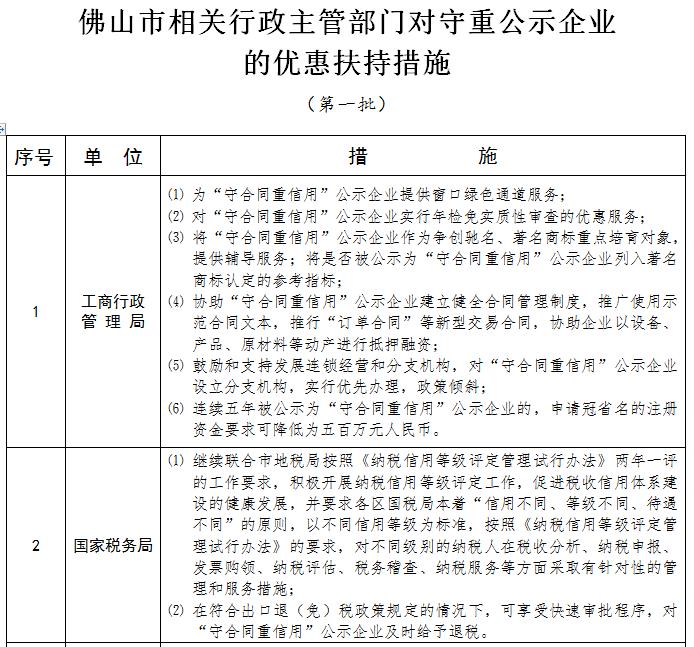 佛山市相關(guān)行政主管部門對(duì)守重公示企業(yè)的優(yōu)惠扶持措施(第一部分)